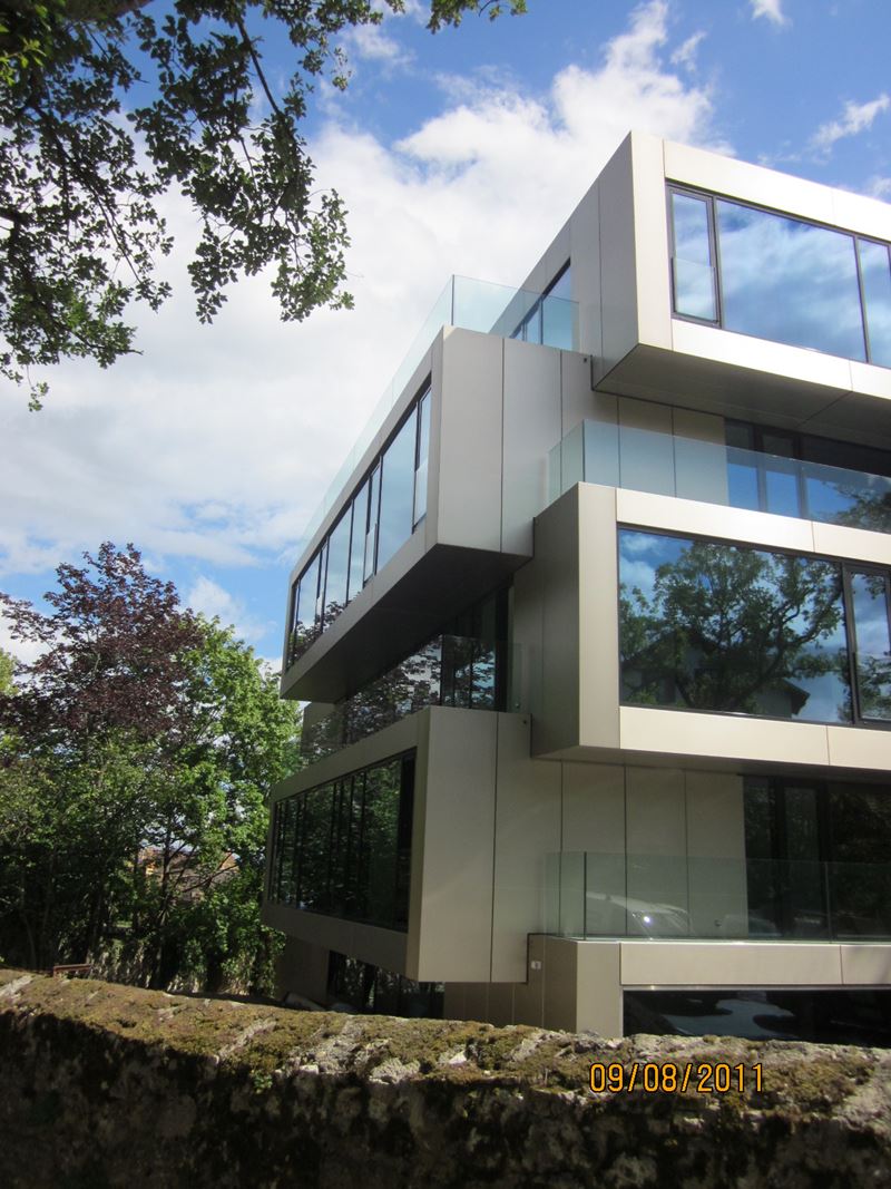 Le revêtement extérieur est en aluminium 3 mm brossé, fixé avec des sous-constructions et des ancrages HSA. Pour l’ensemble du bâtiment, 50'000 pièces ont été dessinées pour 18'000 kg.
