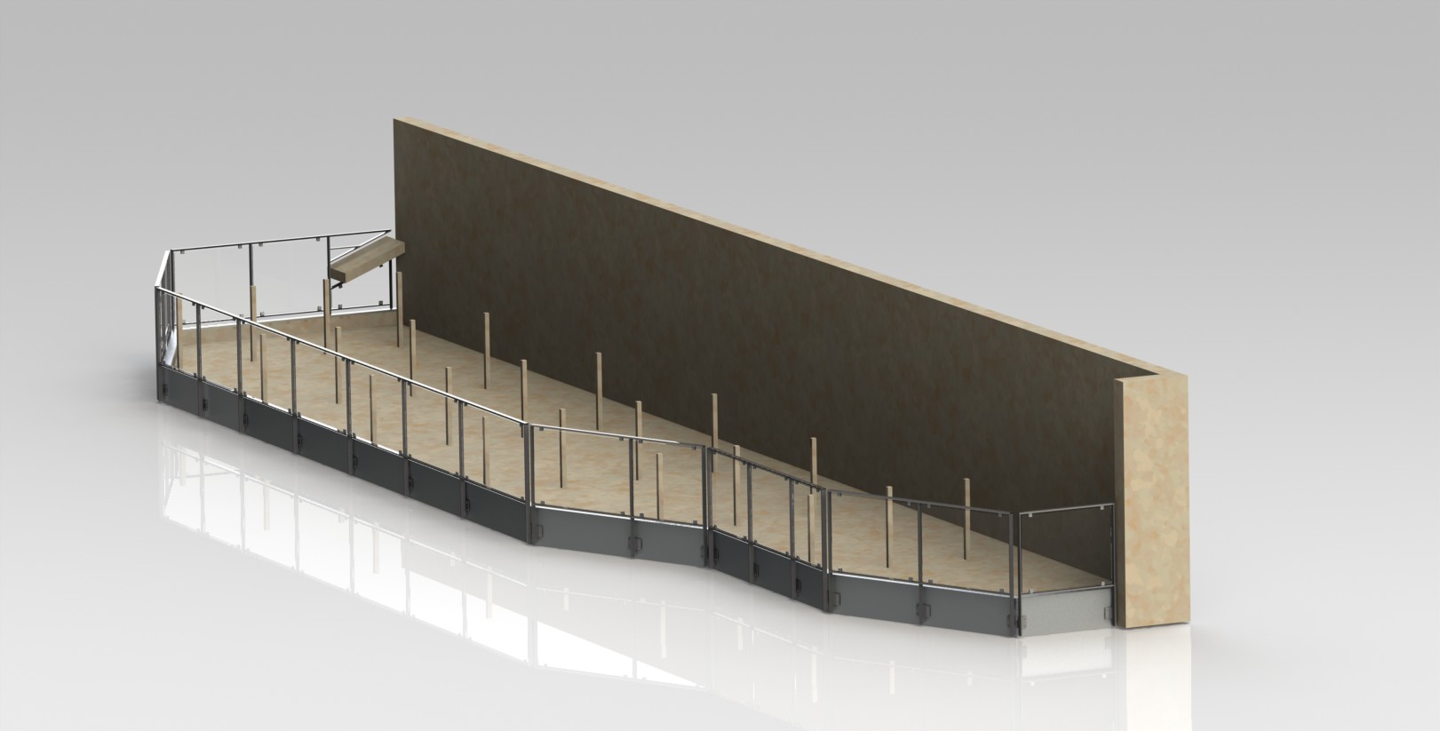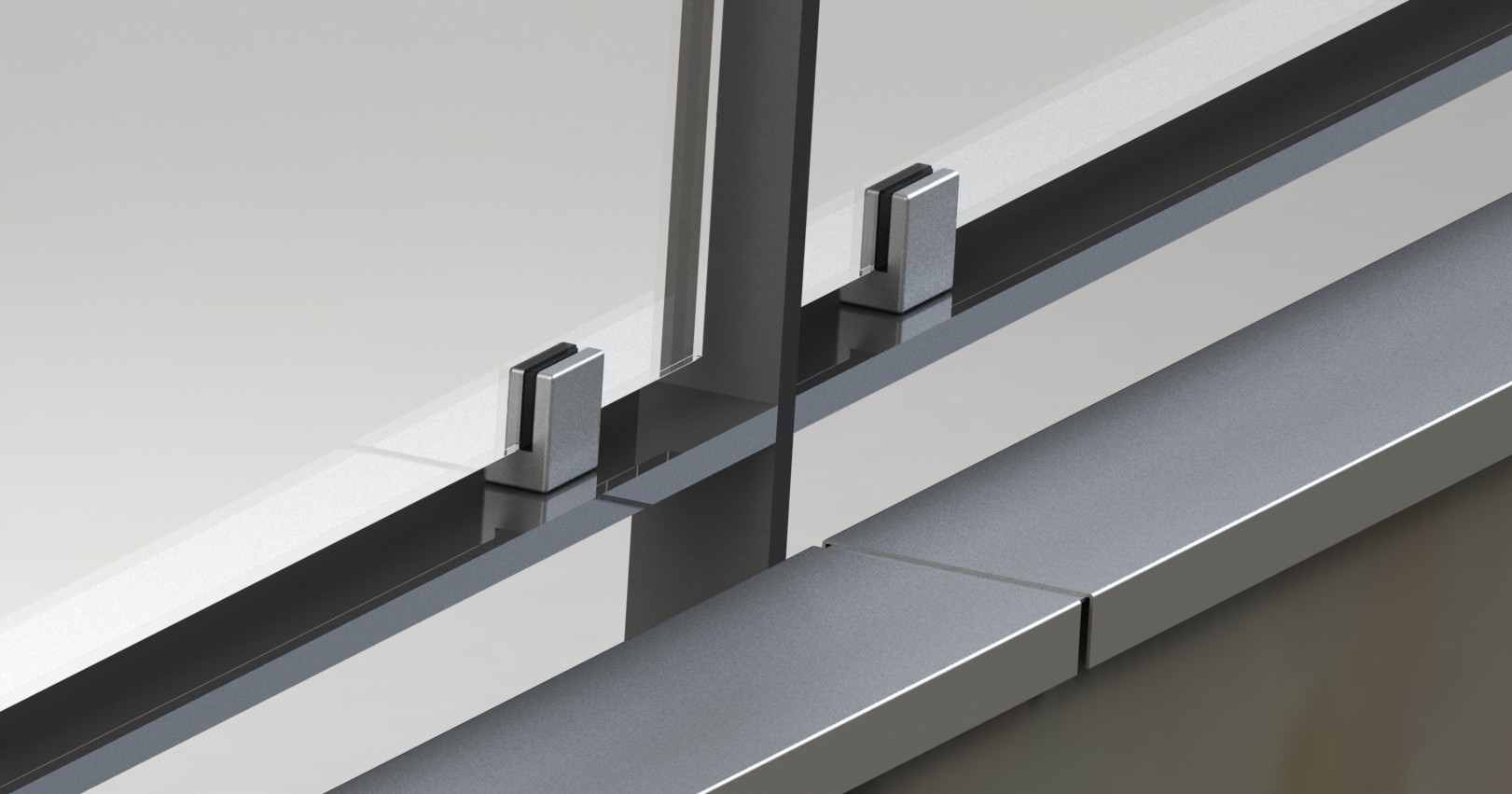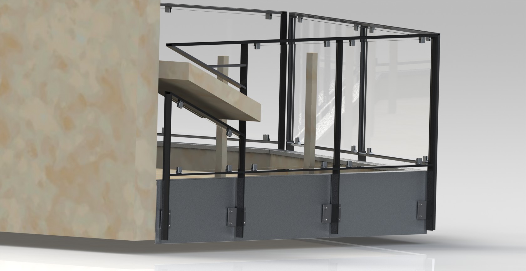 Plusieurs ensembles en plats acier thermolaqué ont été construits, avec des remplissages en verres feuilletés tenus par des pinces. Des tôles en aluminium thermolaqué font office de finition sur la tête de dalle. Le poids total est de 1500 kg.