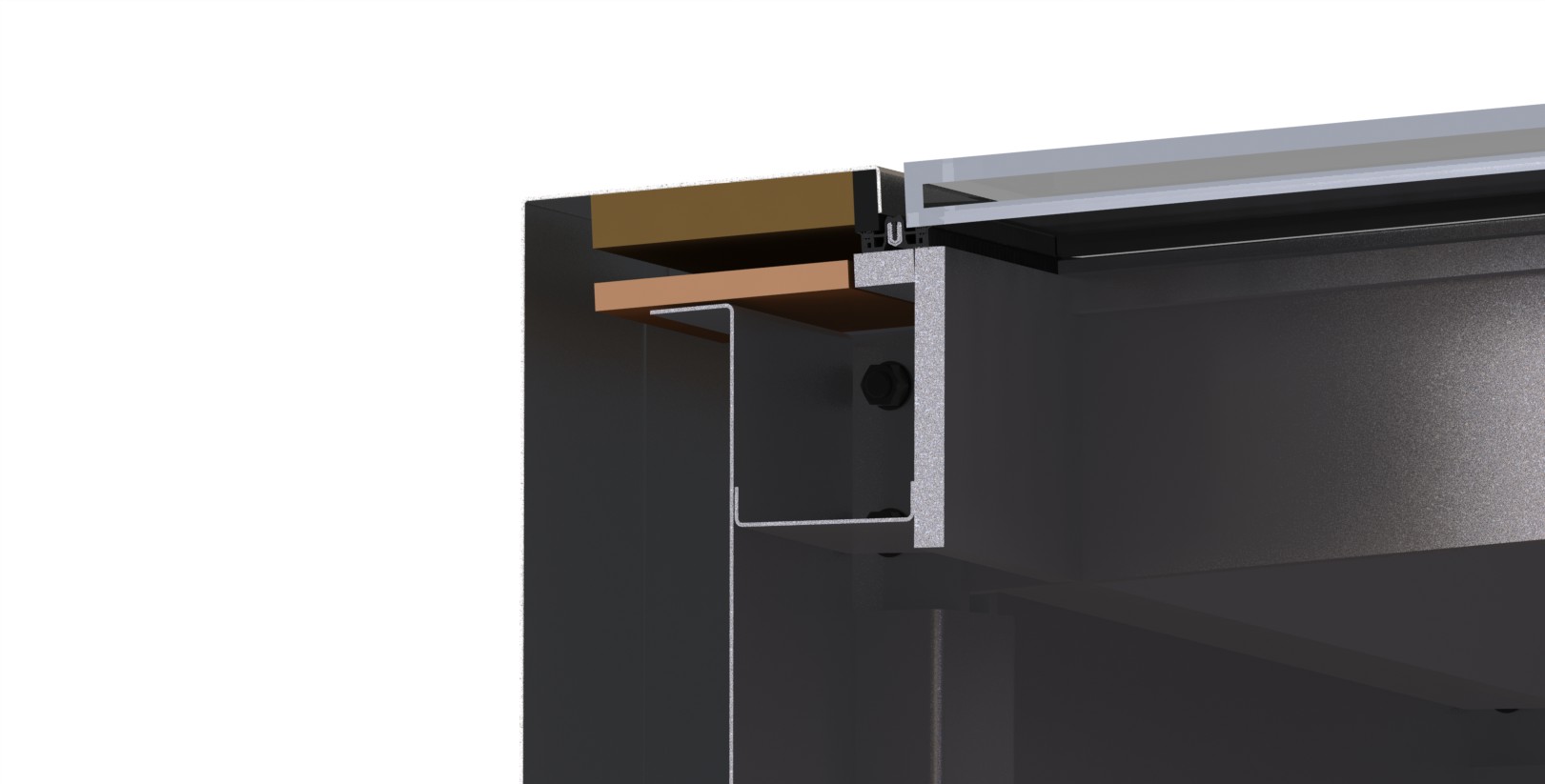 Le système est composé de poteaux-traverses de formes « L » ou « T », formés de deux plats acier 25 mm soudés en atelier. Lors de la pose, les traverses ont été vissées sur les poteaux. Les verres sont isolants triples, d’épaisseur 49 mm, et maintenus par des serreurs. La structure de la verrière est soudée d’une pièce en atelier, et fixée à la façade au chantier.